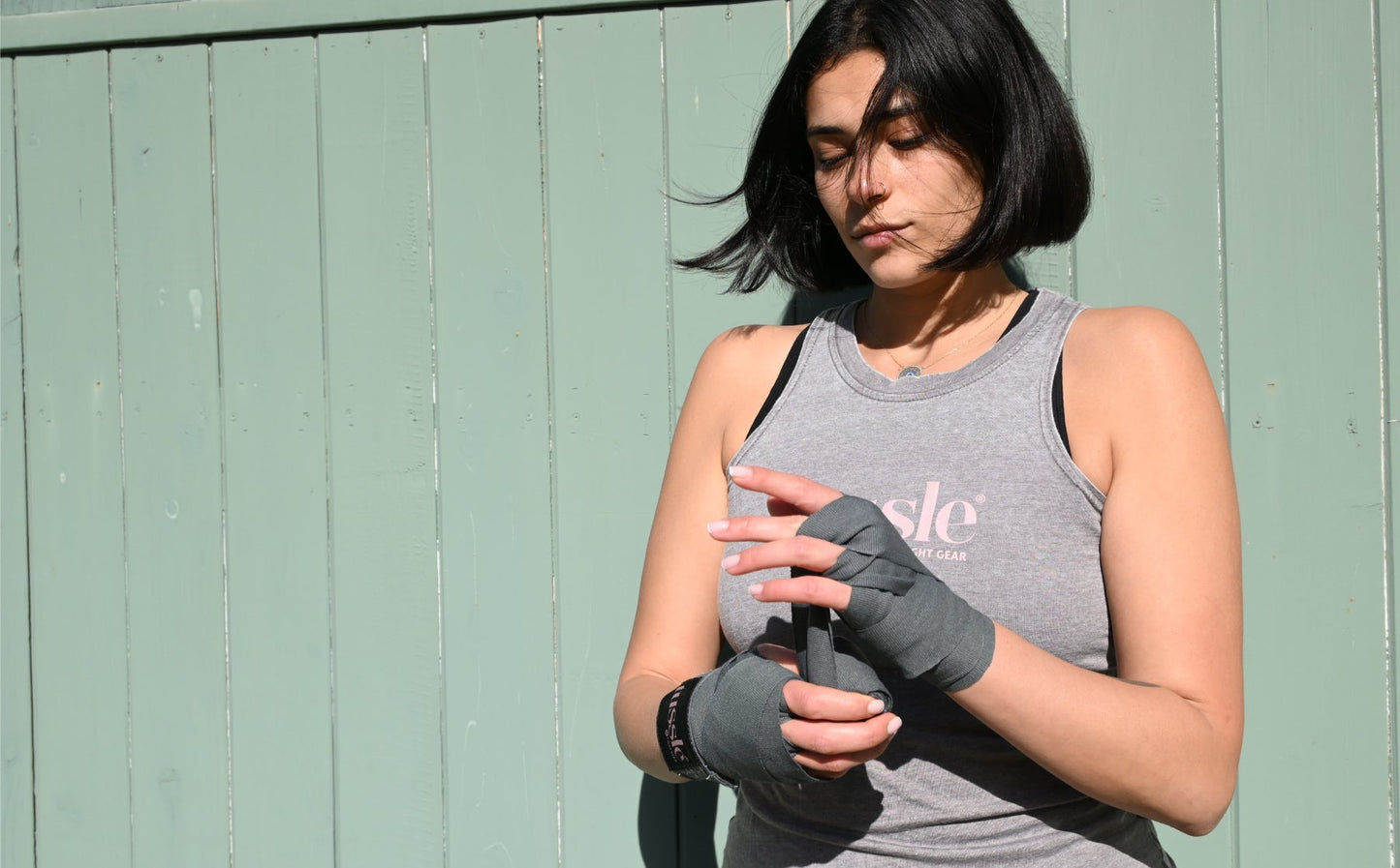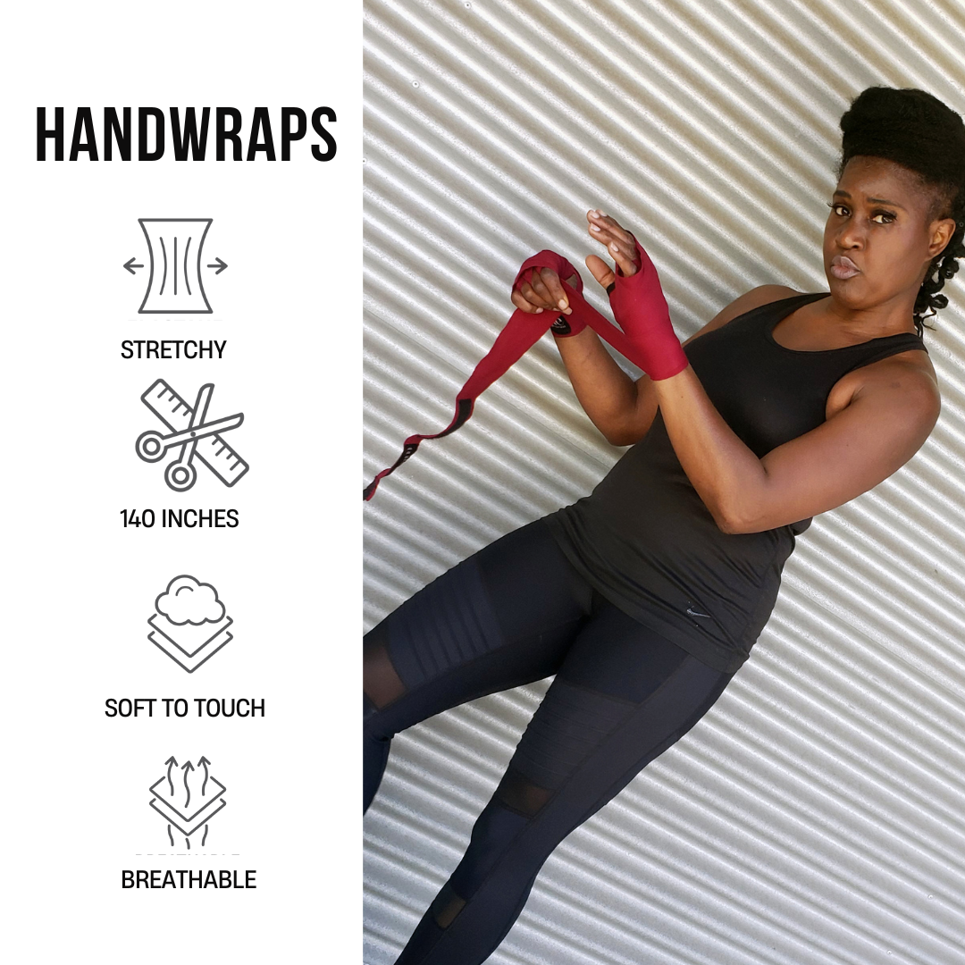 Slightly elastic authentic hand wrap material for a contoured fit. 140" which is the perfect length for a woman's hands.  We do also have 180 inches if you like to add more support. These comfy hand wraps for women come in assorted colors with a black patch and our signature logo. Velcro closure.